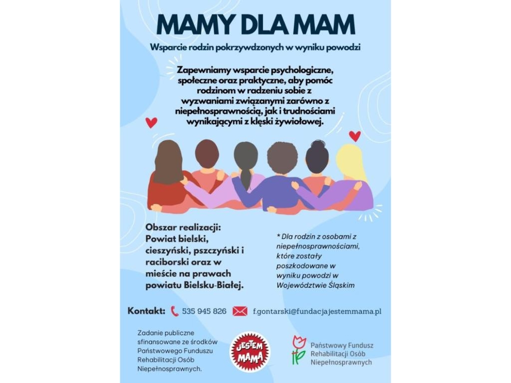 Powiatowe Centrum Pomocy Rodzinie w Cieszynie w imieniu Fundacji "Jestem Mamą" informuje o realizacji projektu „Mamy dla Mam”, skierowanego do rodzin pokrzywdzonych w wyniku powodzi z września 2024 roku, finansowanego przez Państwowy Fundusz Rehabilitacji Osób Niepełnosprawnych.