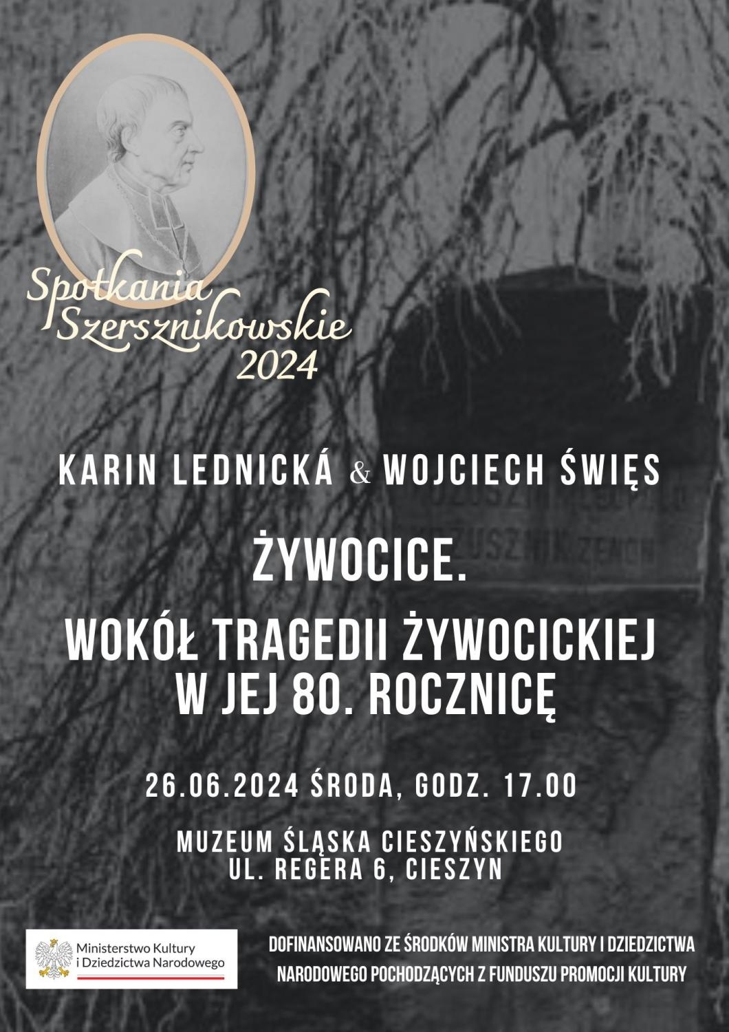 Do wydarzeń w zaolziańskich Żywocicach doszło 6 sierpnia 1944 r. Okupanci w odwecie za przeprowadzoną w nocy z 4/5 sierpnia akcję polskich partyzantów, w czasie której zginęła trójka funkcjonariuszy Gestapo, zamordowali wówczas 36 mężczyzn zamieszkujących Żywocice oraz okoliczne wsie, 16 kolejnych osób aresztowano i w większości zesłano do obozów koncentracyjnych. Represje ciągnęły się przez kolejne miesiące i dotknęły dziesiątki mieszkańców wielu miejscowości na Śląsku Cieszyńskim. Prelegenci: Karin Lednická, czeska pisarka i tłumaczka, autorka książki „Životice: obraz (po)zapomenuté tragédie”, za którą otrzymała nagrodę „Český bestseller” w kategorii „literatura popularnonaukowa” w roku 2022; autorka słynnej trylogii „Šikmý kostel", za pierwszą część której otrzymała główną nagrodę w konkursie „Český bestseller” w roku 2020, oraz Wojciech Święs, cieszyński historyk, doktorant Uniwersytetu Ostrawskiego, redaktor „Pamiętnika Cieszyńskiego” i „Kalendarza Cieszyńskiego”, kierujący Działem Fotografii w Muzeum Śląska Cieszyńskiego, autor wielu artykułów i wystaw represji okresu II wojny światowej.