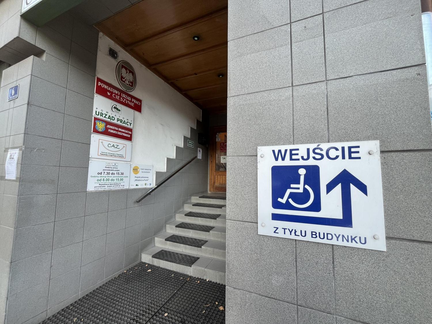Trwają roboty budowlane przy Powiatowy Urząd Pracy w Cieszynie. Zostanie tam zamontowana winda, wyremontowany zostanie układ komunikacyjny i wejście do budynku, a przy nim miejsce postojowe dla osób niepełnosprawnych.