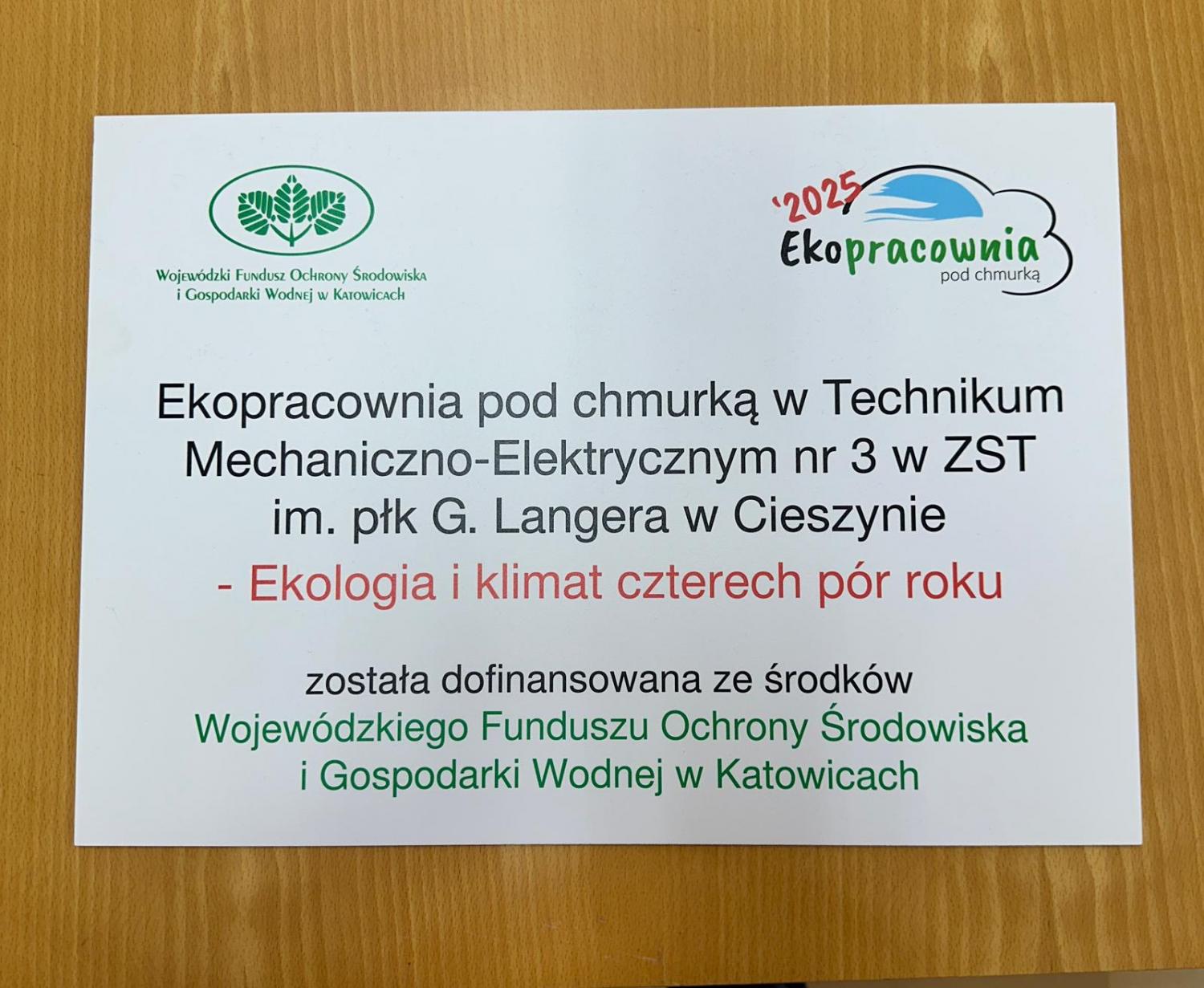 W Zespole Szkół Technicznych im. płk. G. Langera w Cieszynie będzie realizowany projekt pod nazwą „Ekologia i klimat czterech pór roku”. Planowana pracownia wraz ze ścieżką edukacyjną zostanie zrealizowana na terenie ogrodu o powierzchni 10 arów, zlokalizowanego przed budynkiem szkoły.