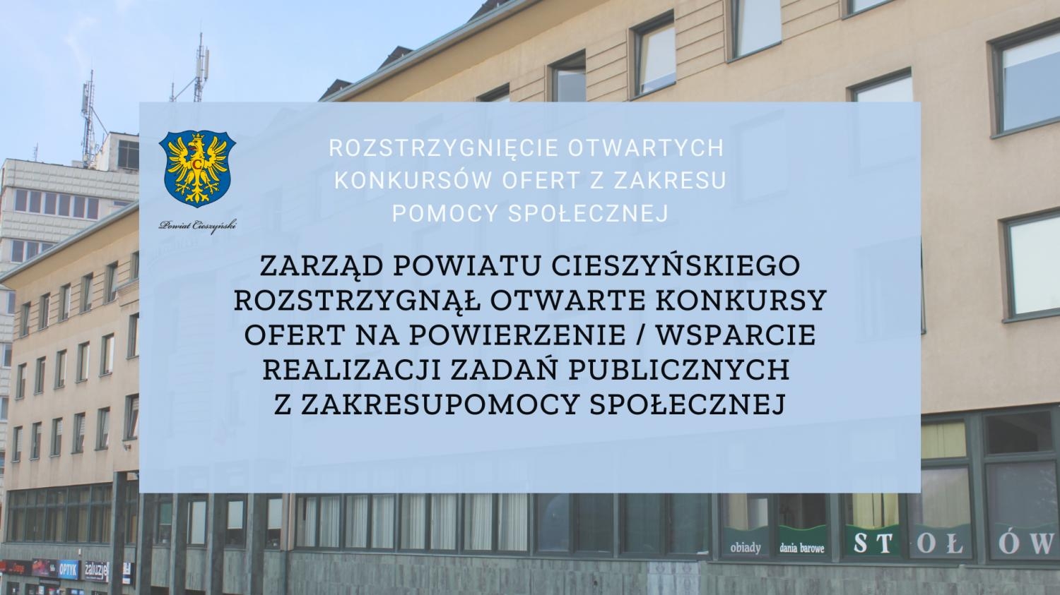 Uchwałą Zarządu Powiatu Cieszyńskiego nr 645/ZP/VI/20 z dnia 17 grudnia 2020 r. rozstrzygnięty został otwarty konkurs ofert na powierzenie realizacji zadania publicznego z zakresu pomocy społecznej polegającego na prowadzeniu dziennego ośrodka wsparcia dla osób z zaburzeniami psychicznymi w latach 2021 – 2024.