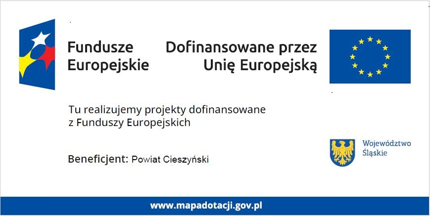 Więcej informacji o projekcie oraz współfinansowaniu ze środków Unii Europejskiej w ramach programu Fundusze Europejskie dla Śląskiego 2021-2027: Wydział Programowania i Funduszy Zewnętrznych Starostwa Powiatowego w Cieszynie, ul. Bobrecka 29, tel. 33 47 77 303 oraz e-mail: wr@powiat.cieszyn.pl