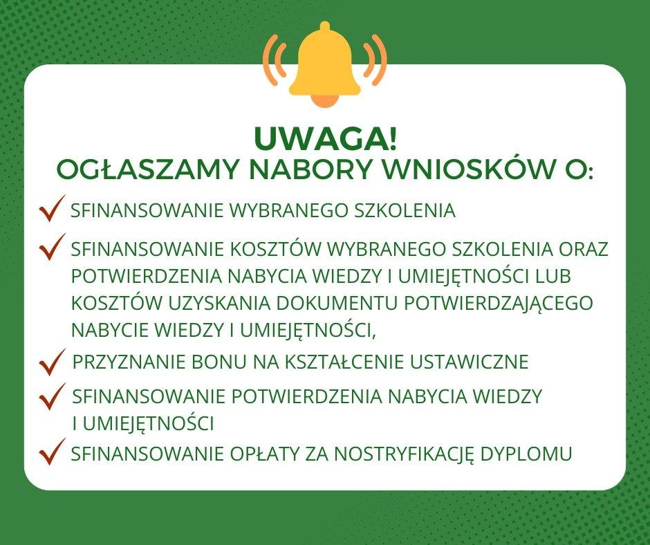 - wniosków o sfinansowanie kosztów wybranego szkolenia oraz potwierdzenia nabycia wiedzy i umiejętności lub kosztów uzyskania dokumentu potwierdzającego nabycie wiedzy