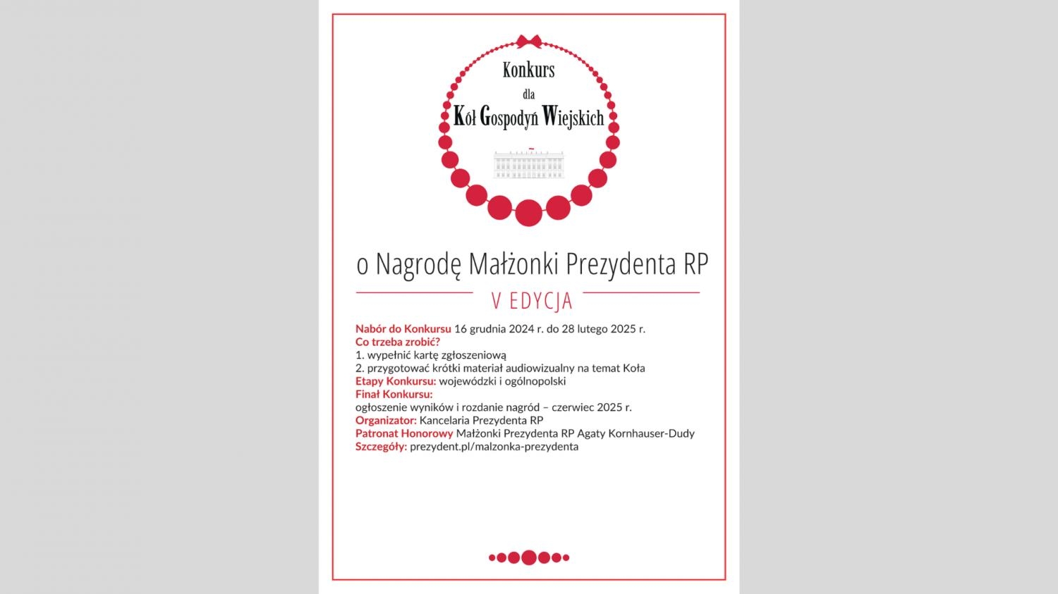 Kancelaria Prezydenta RP ogłasza start V edycji Konkursu dla Kół Gospodyń Wiejskich o Nagrodę Małżonki Prezydenta RP, nad którym Patronat Honorowy objęła Pierwsza Dama, Agata Kornhauser-Duda. Nabór zgłoszeń rozpocznie się 16 grudnia 2024 roku i potrwa do 28 lutego 2025 roku.