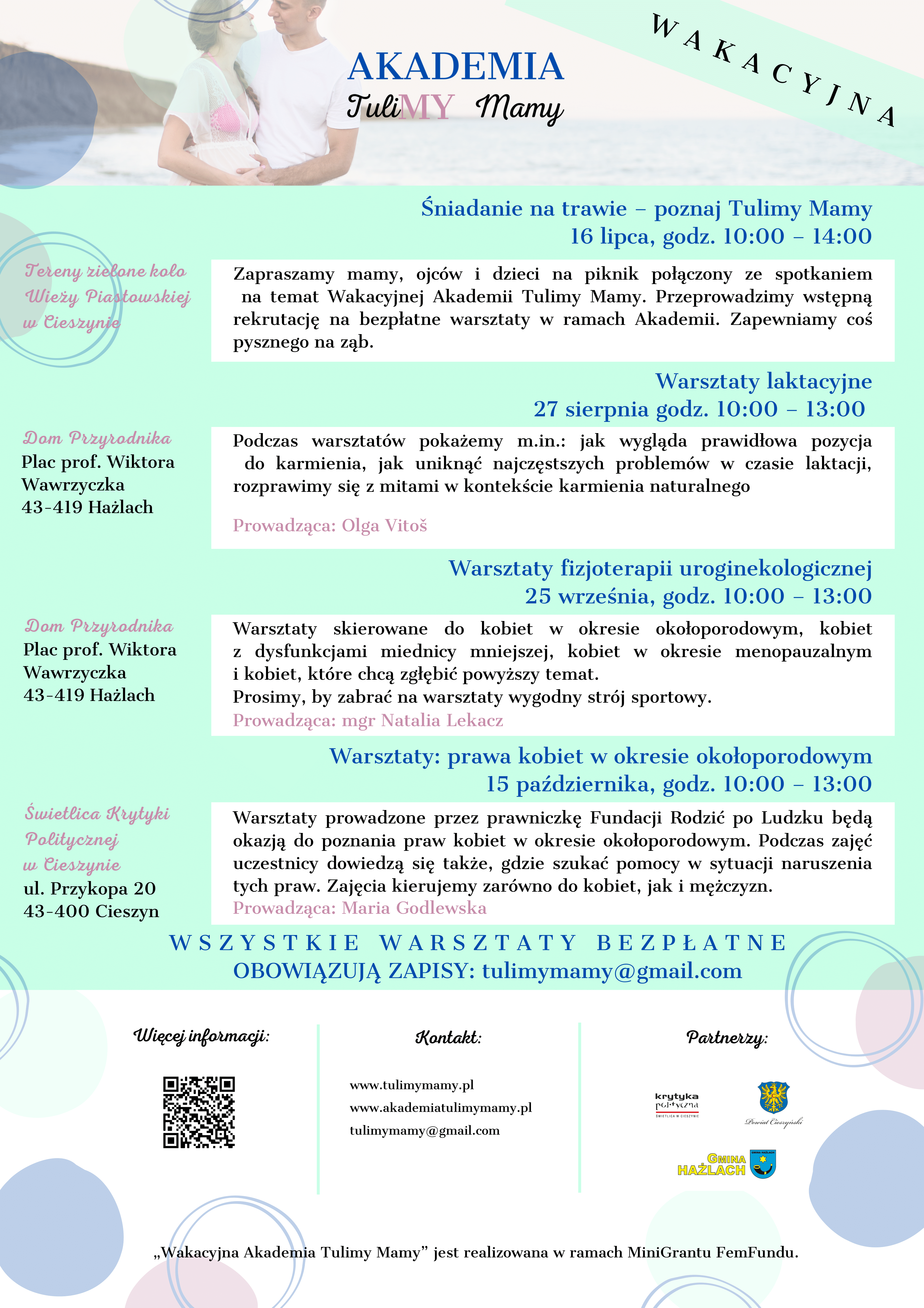Warsztaty na temat karmienia piersią, zajęcia fizjoterapii dla kobiet w każdym wieku, a także praktyczne ćwiczenia z prawniczką, co robić, jeśli czujemy, że u lekarza lub w szpitalu naruszane są nasze prawa. Wszystkie te działania złożą się na akcję „Wakacyjna Akademia Tulimy Mamy“, jaka będzie miała miejsce latem w powiecie cieszyńskim.