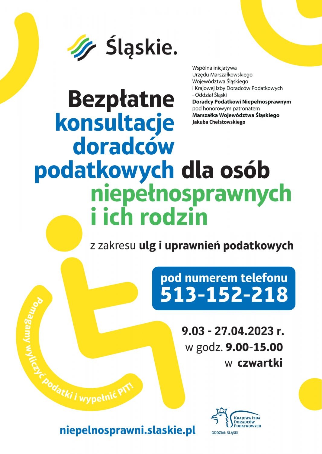 Śląski Oddział KIDP już po raz czternasty organizuje akcję pomocy w rozliczeniach podatkowych pod hasłem „Doradcy podatkowi niepełnosprawnym”. Potrwa ona od 9 marca do 27 kwietnia 2023 roku. Konsultacje podatkowe odbywać się będą raz w tygodniu, w czwartki w godzinach od 9.00 do 15.00 pod numerem telefonu 513-152-218.
