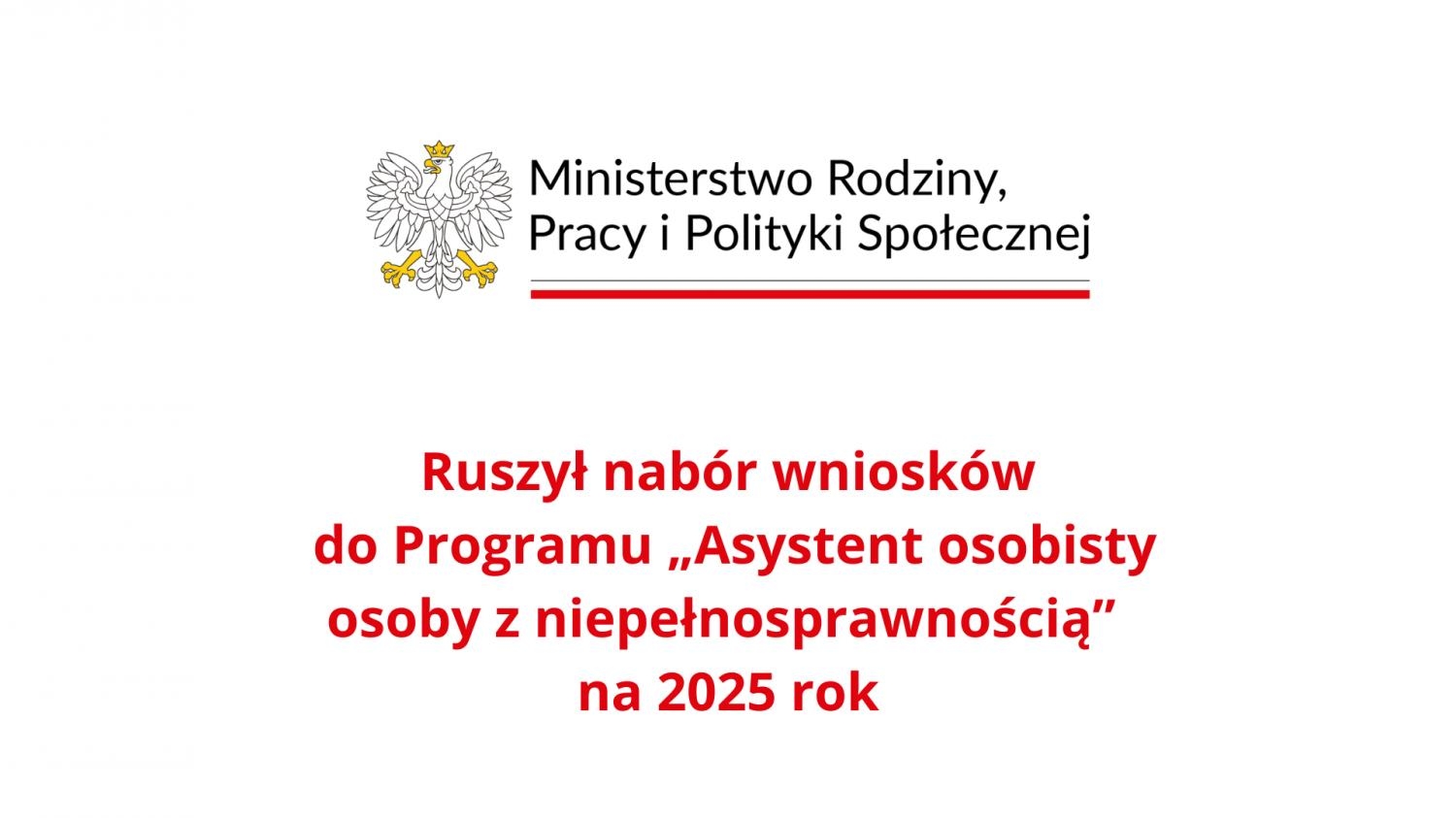 Na grafice widnieje oficjalne logo Ministerstwa Rodziny, Pracy i Polityki Społecznej. W górnej części grafiki znajduje się herb Polski — biały orzeł w złotej koronie. Obok herbu, po prawej stronie, umieszczona jest nazwa ministerstwa: "Ministerstwo Rodziny, Pracy i Polityki Społecznej" w kolorze czarnym, z czerwonymi liniami poniżej tekstu.  Pod spodem, w centralnej części grafiki, znajduje się napis w kolorze czerwonym, informujący o rozpoczęciu naboru wniosków do programu: "Ruszył nabór wniosków do Programu