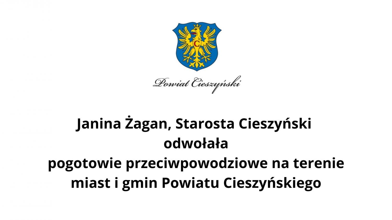 W środę, 5 czerwca 2024 r. o godz. 8:00, Janina Żagan, Starosta Cieszyński odwołała pogotowie przeciwpowodziowe, które obowiązywało od wtorku, 4 czerwca 2024 r. od godz. 8:15 na terenie miast i gmin Powiatu Cieszyńskiego.