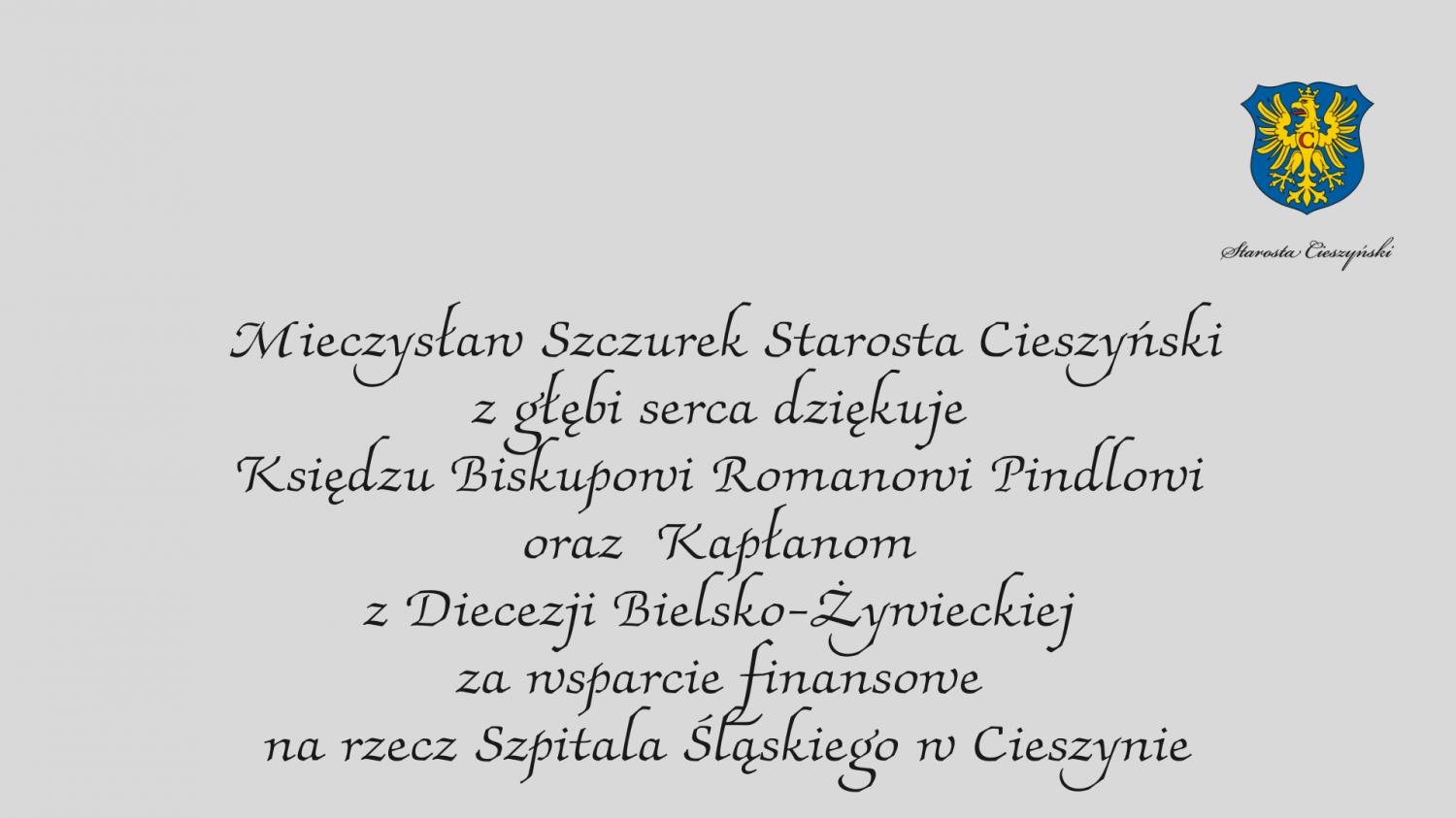 - W imieniu Dyrekcji Szpitala Śląskiego w Cieszynie, Mieszkańców Powiatu Cieszyńskiego oraz całego Regionu z głębi serca wyrażam ogromną wdzięczność Księdzu Biskupowi Romanowi Pindlowi i kapłanom z Diecezji Bielsko-Żywieckiej, którzy wykazali się niezwykłą hojnością oraz zaangażowaniem przekazując znaczące wsparcie finansowe na rzecz naszego Szpitala. Dziękuję Wam za ten życzliwy gest i nieocenione wsparcie, powiedział Mieczysław Szczurek, Starosta Cieszyński.