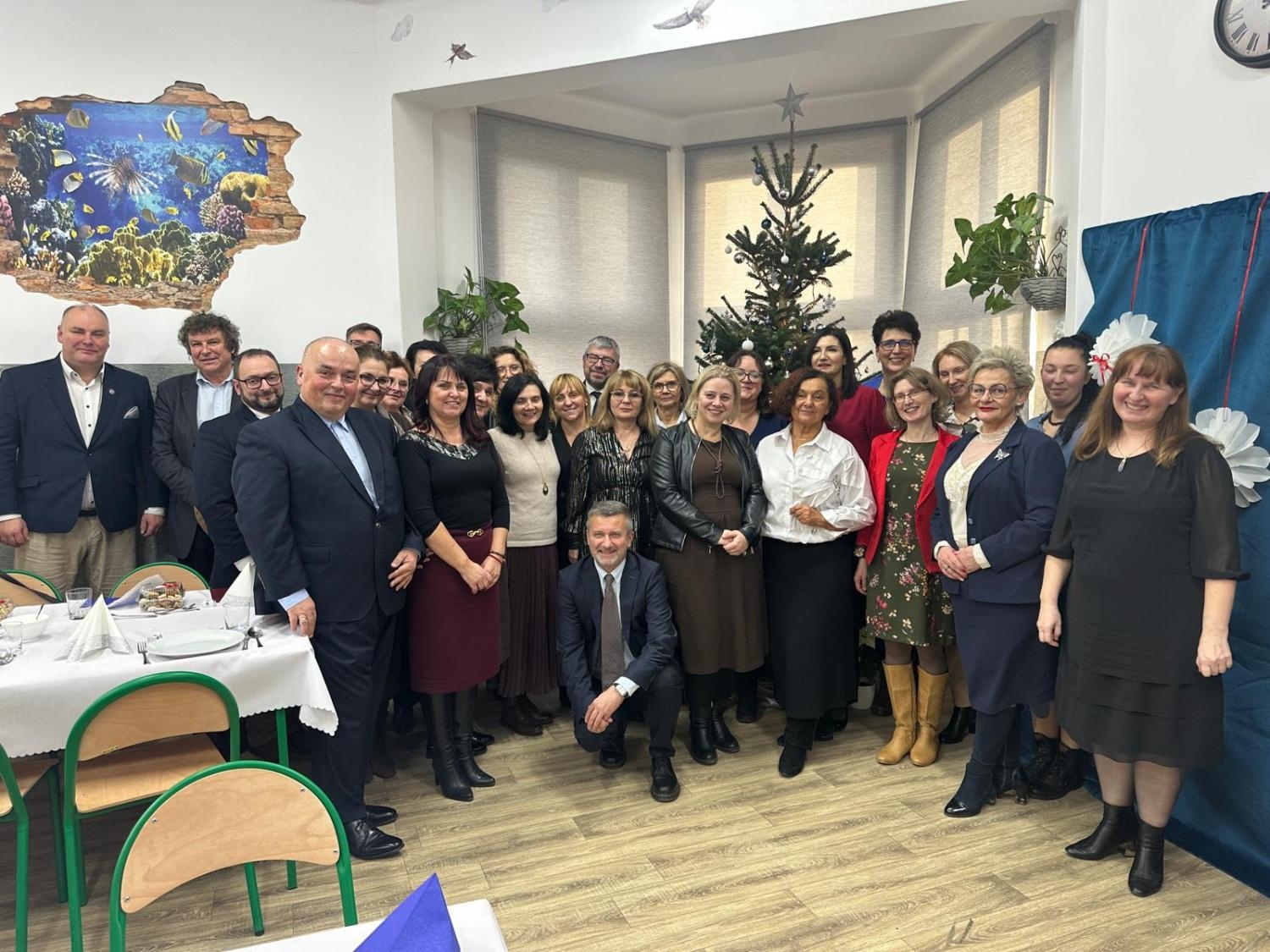 Na zdjęciu znajduje się grupa kilkudziesięciu osób ubranych elegancko, zgromadzonych w jasnym pomieszczeniu z choinką ozdobioną świątecznymi dekoracjami w tle. Uśmiechnięci uczestnicy pozują wspólnie, stojąc i siedząc przy nakrytych stołach. Na ścianie widoczna jest ozdoba w kształcie akwarium.