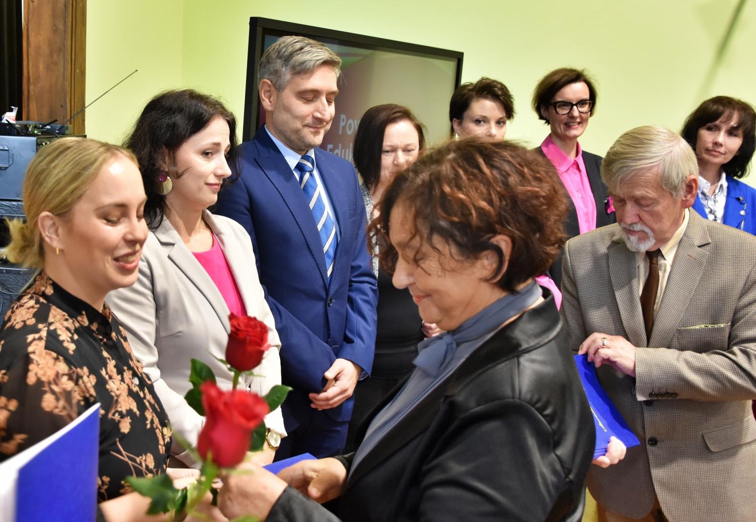 Na zdjęciu widać nauczycieli odbierających akty mianowania. Wręczają je widoczni Janina Żagan, starosta cieszyński, oraz przewodniczący Rady Powiatu Cieszyńskiego, Stanisław Kubicius.