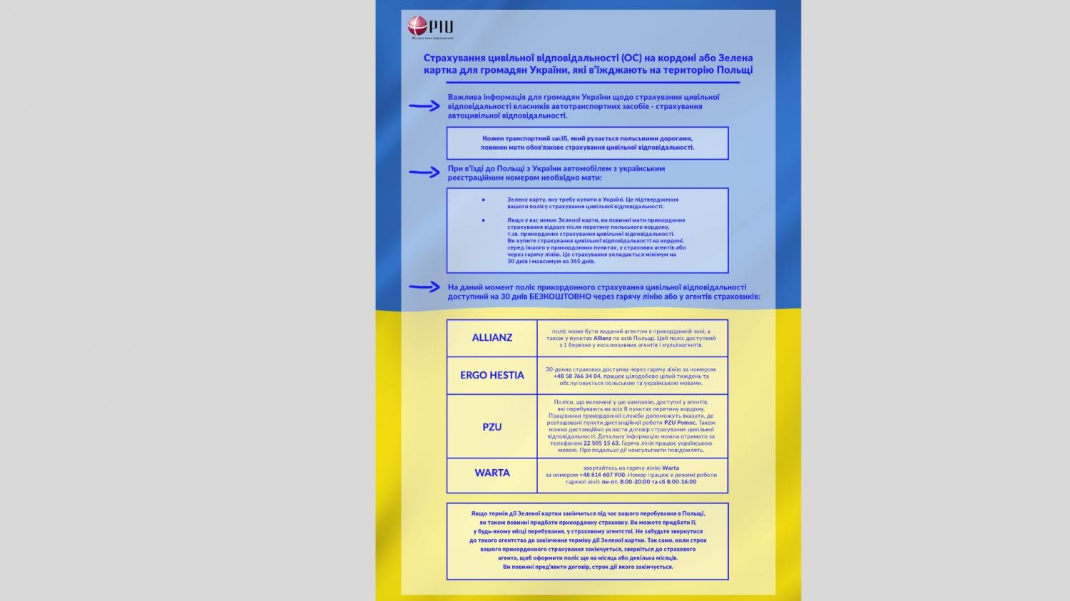 Ubezpieczenie graniczne na 30 dni dla osób wjeżdżających z Ukrainy są bezpłatne. Oferują je Allianz, ERGO Hestia, PZU oraz Warta – ubezpieczenia są dostępne u agentów tych firm na przejściach granicznych lub poprzez infolinię.