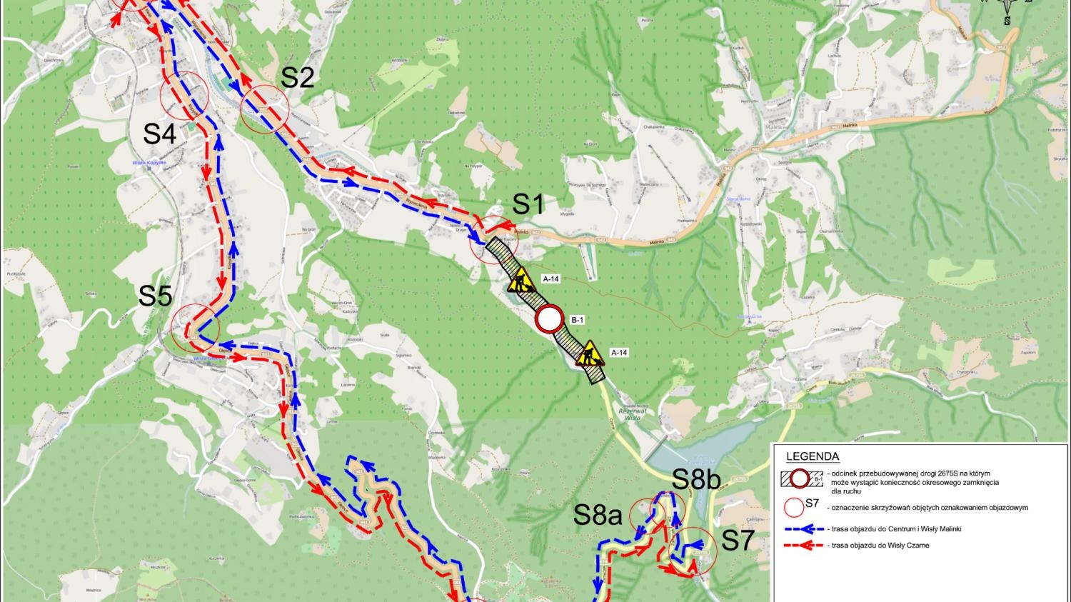 W związku z trwającą realizacją zadania pn. „Rozbudowa z przebudową drogi powiatowej 2675 S – ul. Czarne w Wiśle na odcinku 2,9 km – etap I – od obrębu skrzyżowania z drogą wojewódzką 942 (na odc. ok. 1,4 km)” w ramach projektu „Poprawa spójności komunikacyjnej pomiędzy powiatem cieszyńskim i okresem Čadca, a drogą ekspresową D3 w ramach sieci TEN-T”, Generalny Wykonawca Firma FB Serwis informuje mieszkańców oraz użytkowników drogi powiatowej 2675 S - ul. Czarne w Wiśle, że z przyczyn technologicznych oraz dla zapewnienia bezpieczeństwa ruchu drogowego, na czas wykonywania robót na obiekcie ściany oporowej nr 2, w rejonie km drogi od 0+230,00 do 0+360,00 od dnia 4 maja 2020 r. od godziny 07:00 zostanie wdrożona tymczasowa organizacja ruchu polegająca na całkowitym wyłączeniu z ruchu odcinka o długości 200 metrów ul. Czarne (od km 0+200,00 do km 0+400,00), usytuowanego pomiędzy skrzyżowaniem z os. Bajcary, a Małą Zaporą na rzece Wiśle.
