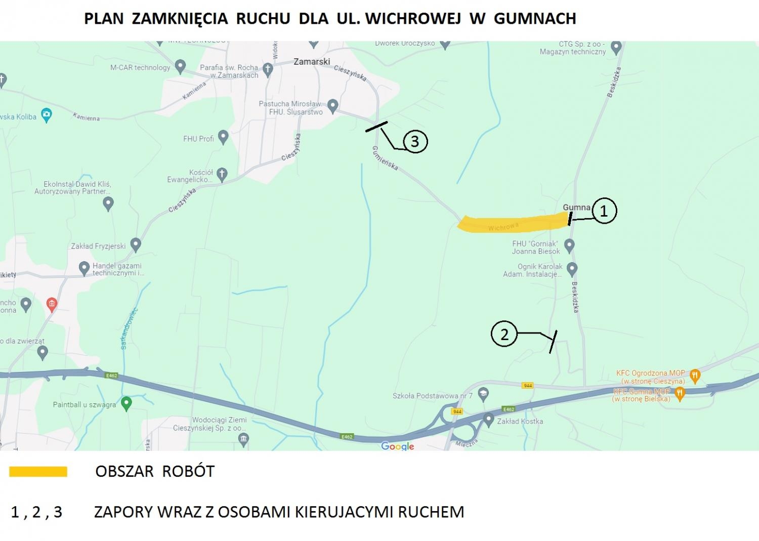 z przyczyn technologicznych oraz bezpieczeństwa ruchu drogowego, na czas realizacji remontu, w dniu 29 lipca (poniedziałek) oraz 30 lipca (wtorek) 2024r. w godz. od 700 do 1700 ruch pojazdów na ul. Wichrowej w miejscowości Gumna na odcinku około 0,65 km (od skrzyżowania z ulicą Beskidzką) będzie wstrzymany.