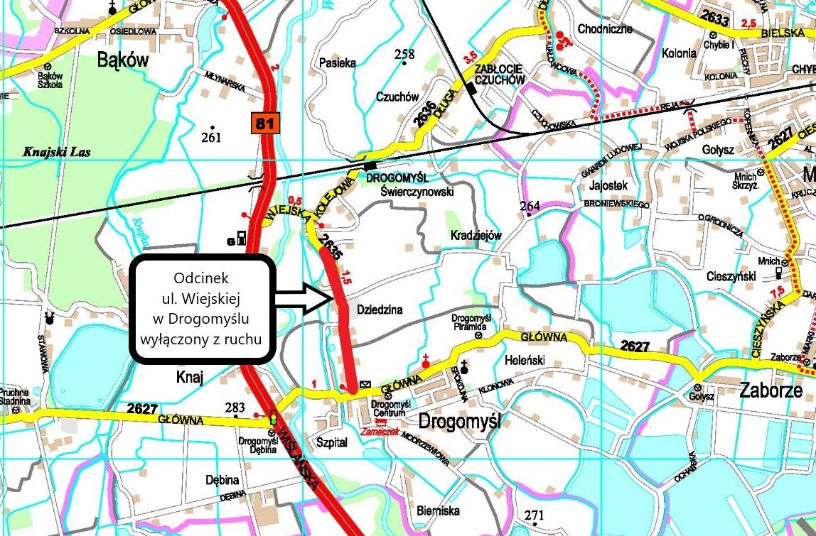 W związku z trwającym remontem drogi powiatowej nr 2635 S — ul. Wiejskiej w Drogomyślu, na odcinku około 1,2 km, Powiatowy Zarząd Dróg Publicznych w Cieszynie informuje, że z przyczyn technologicznych oraz dla zapewnienia bezpieczeństwa ruchu drogowego, na czas realizacji remontu, w dniach 24 sierpnia (sobota) i 26 sierpnia (poniedziałek) 2024 r. w godzinach od 7:30 do 16:00 ruch pojazdów na ul. Wiejskiej w Drogomyślu na odcinku około 1,2 km (od skrzyżowania z ul. Główną do obrębu posesji nr 65) będzie wstrzymany.