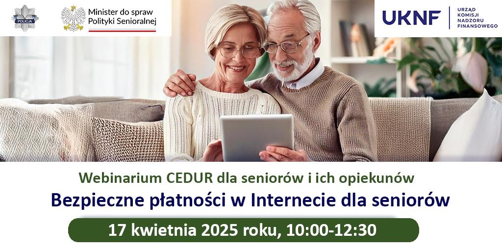 Grafika promuje webinarium "Bezpieczne płatności w Internecie dla seniorów" organizowane przez UKNF, Ministerstwo do spraw Polityki Senioralnej i Policję, zaplanowane na 17 kwietnia 2025 roku. Na grafice starsza para korzysta wspólnie z tabletu, siedząc na kanapie w swoim domu.