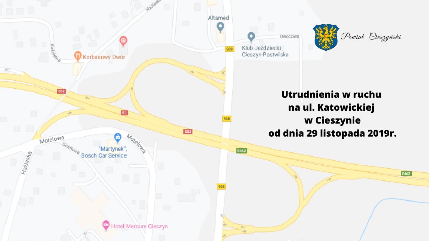 Utrudnienia w ruchu na ul. Katowickiej w Cieszynie - wyłączenie z ruchu łącznicy S52 z ul. Katowicką w Cieszynie - od dnia 29 listopada 2019r.