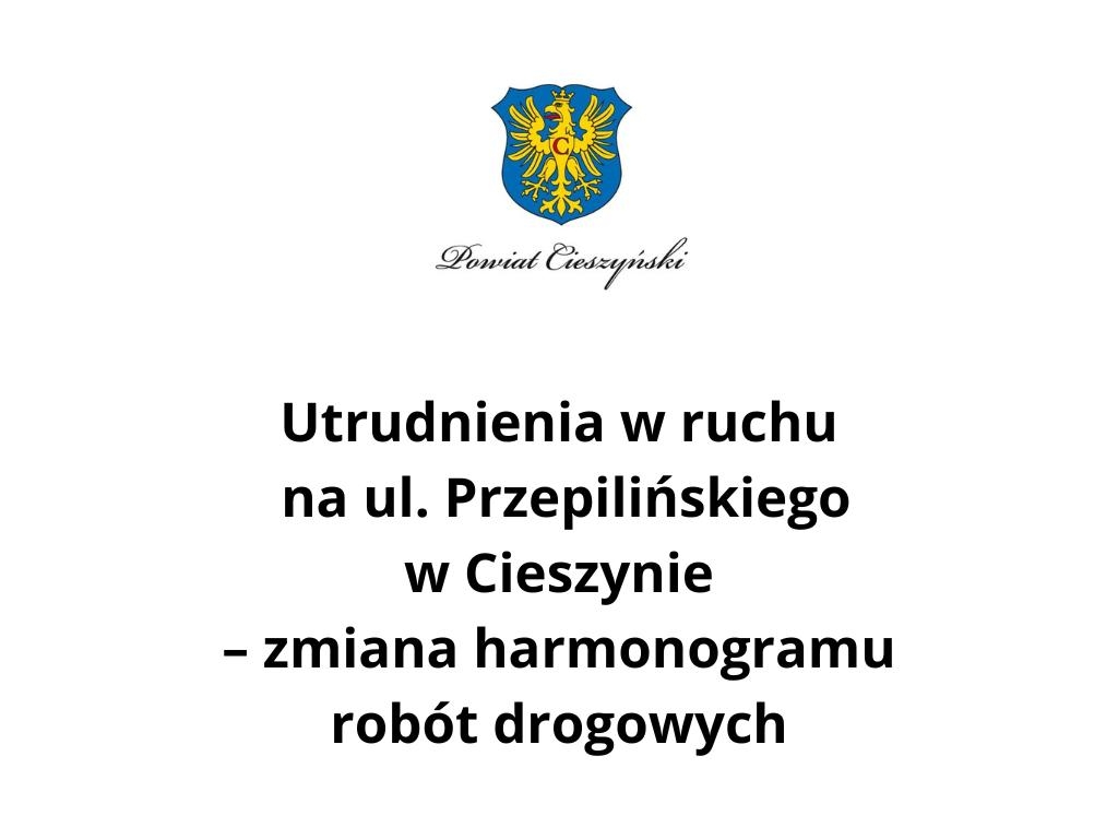 Powiatowy Zarząd Dróg Publicznych w Cieszynie informuje o planowanych utrudnieniach w ruchu drogowym na ulicy Przepilińskiego, związanych z realizacją inwestycji pn. „Rozbudowa ulicy Przepilińskiego w Cieszynie na odcinku od skrzyżowania z ulicą Stawową do skrzyżowania z ulicą Kajzara”.
