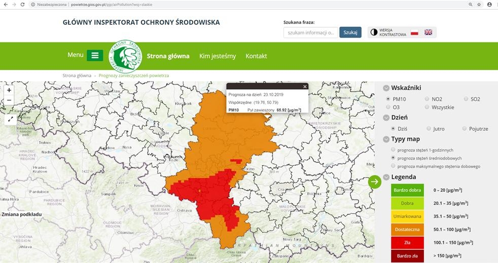 W dniu 23 października 2019 r. jakość powietrza na obszarze województwa śląskiego ze względu na poziom pyłu zawieszonego (stężenie dobowe) będzie dostateczna i zła. Zagrożenie: ryzyko wystąpienia przekroczenia poziomu informowania (101-150 µg/m3) dla pyłu zawieszonego PM10 w powietrzu.
