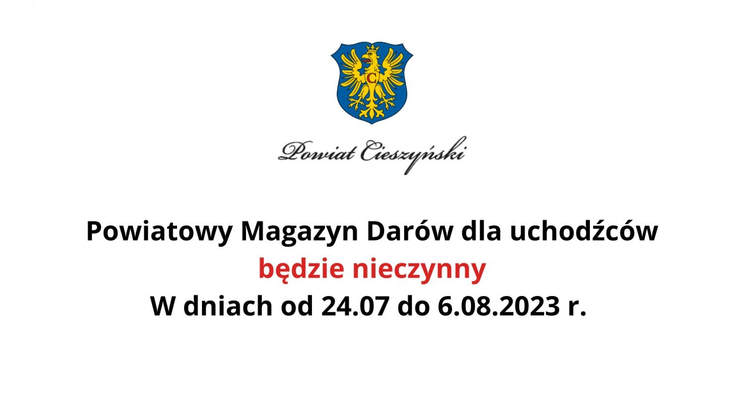 UWAGA! Powiatowy Magazyn Darów dla uchodźców będzie nieczynny w dniach od 24.07 do 6.08.2023 r.