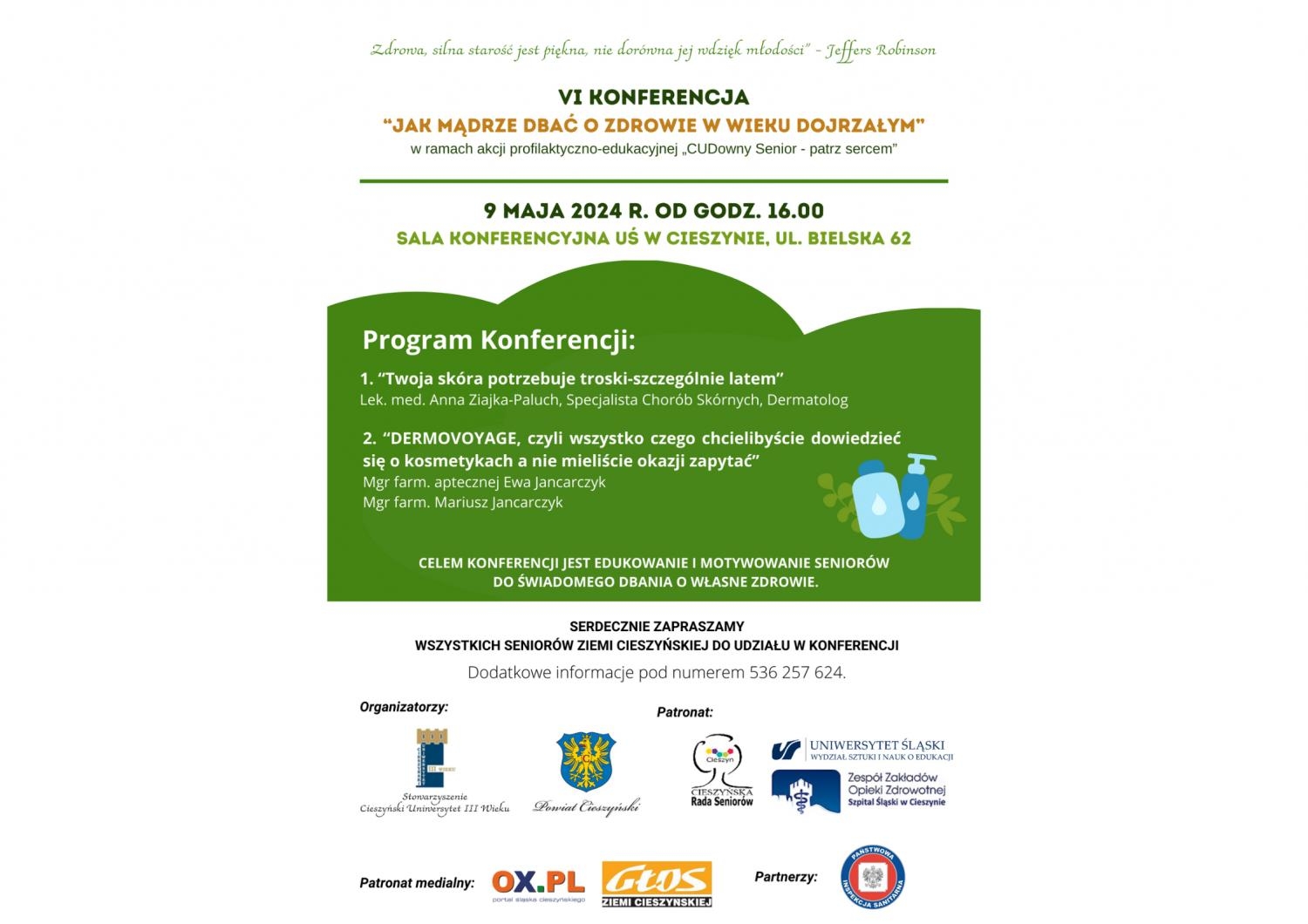 Stowarzyszenie Cieszyński Uniwersytet III Wieku wraz z Powiatem Cieszyńskim zapraszają seniorów z terenu powiatu cieszyńskiego do udziału w VI konferencji "Jak mądrze dbać o zdrowie w wieku dojrzałym", w ramach akcji profilaktyczno-edukacyjnej „CUDowny Senior – patrz sercem”, która odbędzie się w dniu 9 maja 2024 r., o godz. 16:00 w sali konferencyjnej UŚ w Cieszynie, ul. Bielska 62.