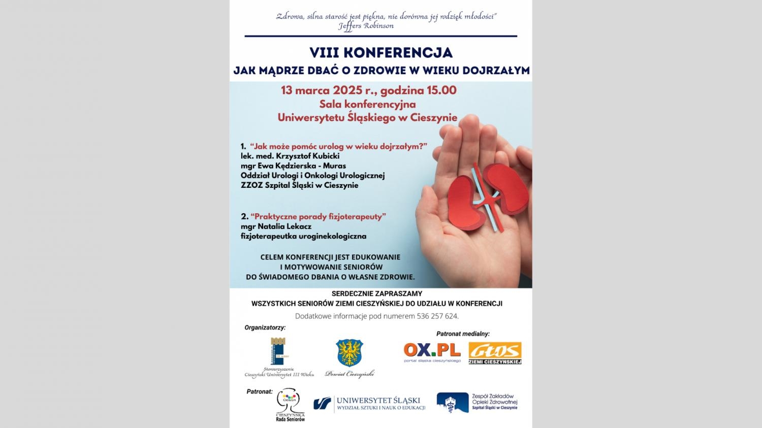 Z myślą o nich 13 marca 2025 roku o godzinie 15:00 na Sali konferencyjnej Uniwersytetu Śląskiego w Cieszynie odbędzie się VIII Konferencja pt. „Jak mądrze dbać o zdrowie w wieku dojrzałym”.