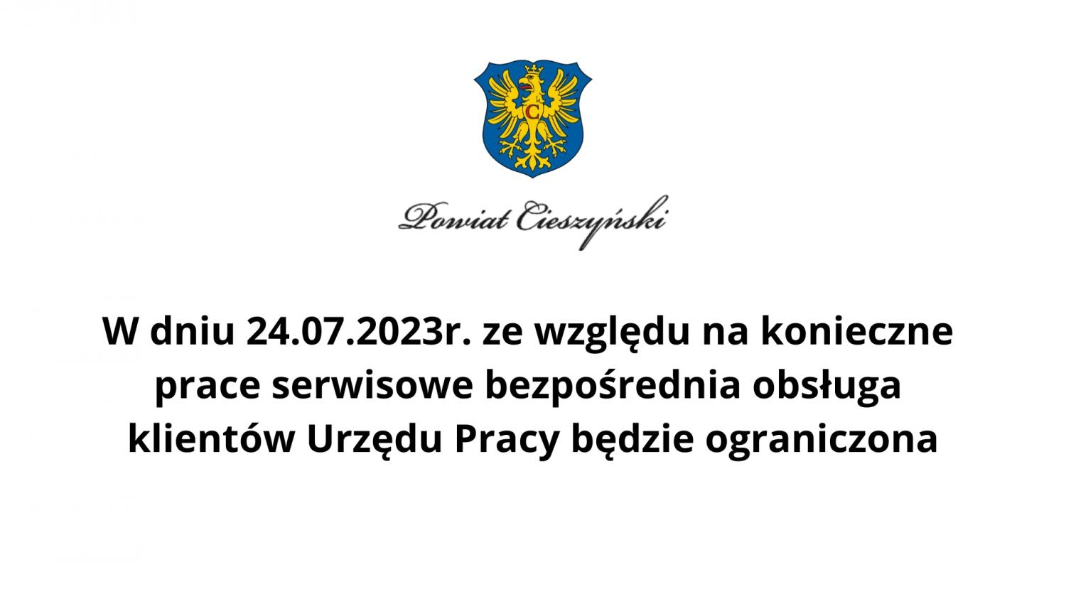 W dniu 24.07.2023r. bezpośrednia obsługa klientów Urzędu Pracy w Cieszynie będzie ograniczona
