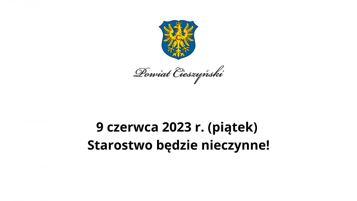 Informuję, że Starostwo Powiatowe w Cieszynie, Powiatowe Centrum Pomocy Rodzinie w Cieszynie, Powiatowy Zarząd Dróg Publicznych w Cieszynie, w dniu 9 czerwca 2023 r. (piątek) będą nieczynne.