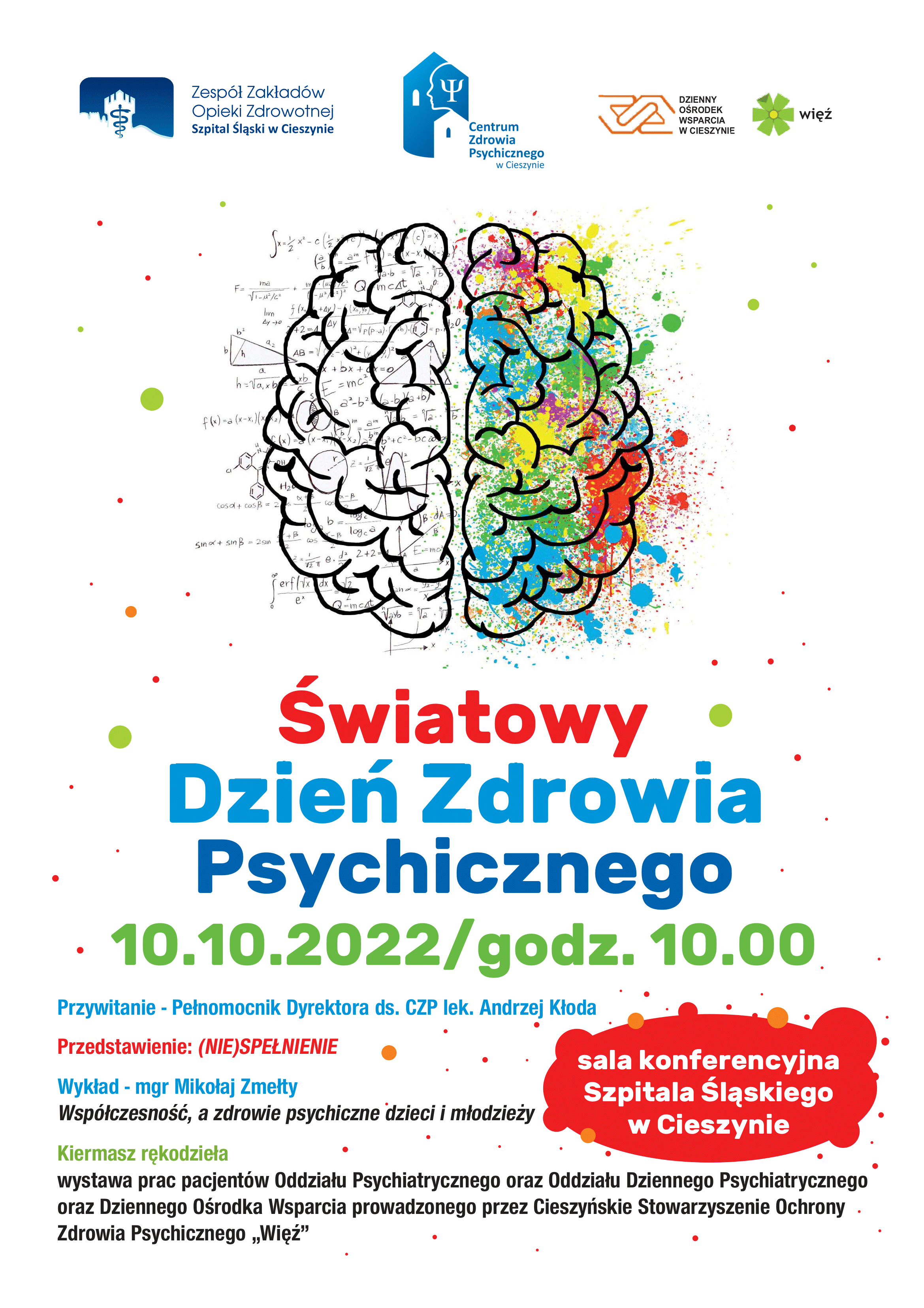 Wydarzenie organizowane przez Centrum Zdrowia Psychicznego przy Szpitalu Śląskim w Cieszynie wraz z Dziennym Ośrodkiem Wsparcia w Cieszynie „Więź” wpisuje się w obchody Światowego Dnia Zdrowia Psychicznego, które każdego roku obchodzone jest 10 października. Święto to zostało ustanowione przez Światową Federację Zdrowia Psychicznego już w 1992 roku. Celem tego dnia jest zwrócenie szczególnej uwagi na dbałość o zdrowie psychiczne, podniesienie świadomości na temat istoty zdrowia psychicznego oraz dyskusja nad problemami natury psychicznej, a także roli pomocy i wsparcia w chorobie oraz metod ulepszania opieki medycznej nad chorymi psychicznie. W najbliższy poniedziałek, 10 października, o godz. 10:00 w sali konferencyjnej Szpitala Śląskiego (parter, pawilon diagnostyczno-zabiegowy) odbędzie się otwarte spotkanie dla mieszkańców Cieszyna poświęcone dbałości o zdrowie psychiczne.
