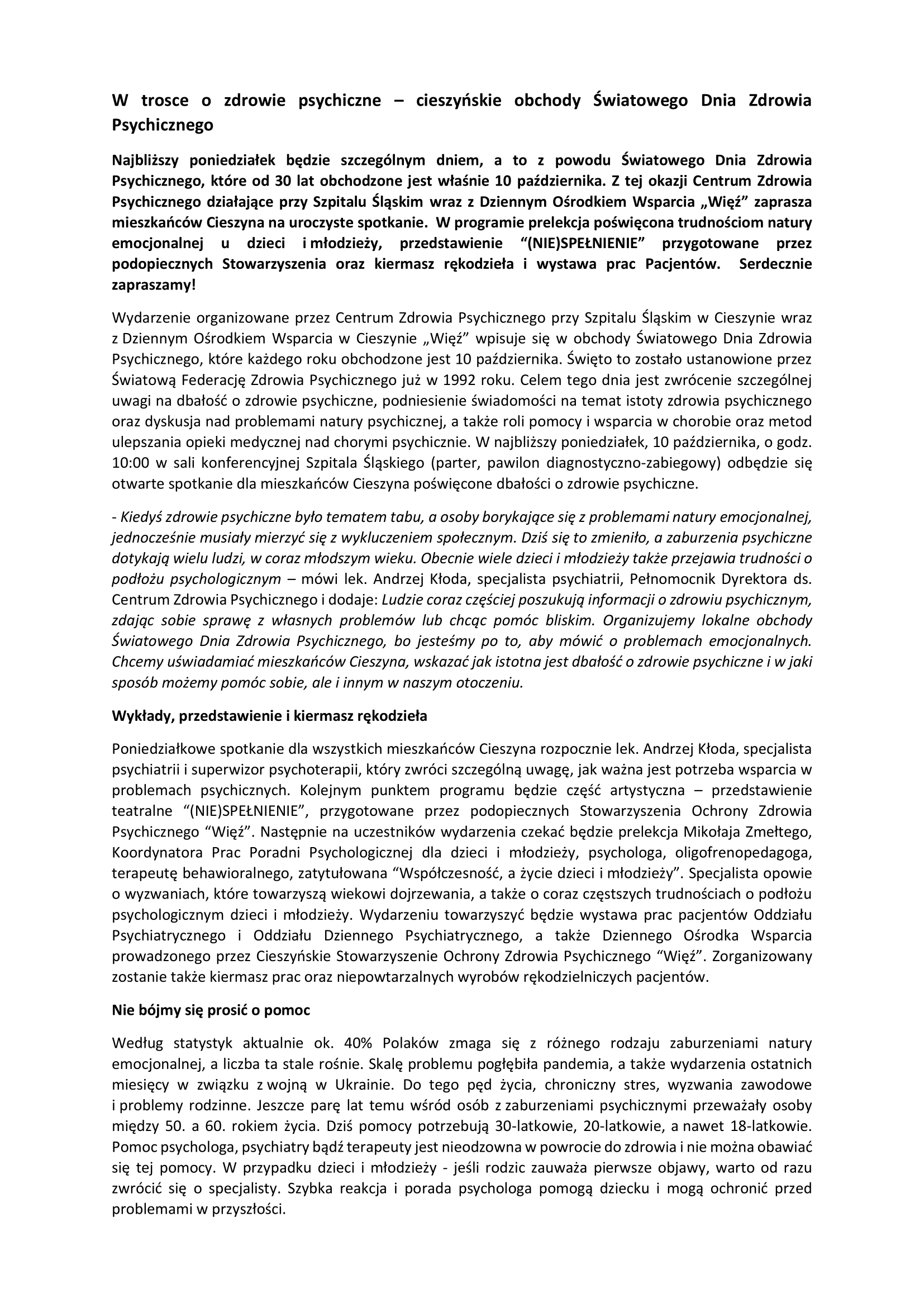 Najbliższy poniedziałek będzie szczególnym dniem, a to z powodu Światowego Dnia Zdrowia Psychicznego, które od 30 lat obchodzone jest właśnie 10 października. Z tej okazji Centrum Zdrowia Psychicznego działające przy Szpitalu Śląskim wraz z Dziennym Ośrodkiem Wsparcia „Więź” zaprasza mieszkańców Cieszyna na uroczyste spotkanie. W programie prelekcja poświęcona trudnościom natury emocjonalnej u dzieci i młodzieży, przedstawienie “(NIE)SPEŁNIENIE” przygotowane przez podopiecznych Stowarzyszenia oraz kiermasz rękodzieła i wystawa prac Pacjentów. Serdecznie zapraszamy!