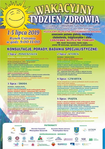 Serdecznie zapraszamy do udziału w ramach bezpłatnej akcji profilaktycznej dla społeczności Ustronia i Powiatu Cieszyńskiego pt.: „Wakacyjny Tydzień Zdrowia", która odbędzie się w dniach od 1 do 5 lipca br. w godzinach od 9.00 do 13.00 na Rynku Ustronia przy współorganizacji Starostwa Powiatowego w Cieszynie i Urzędu Miejskiego w Ustroniu.
