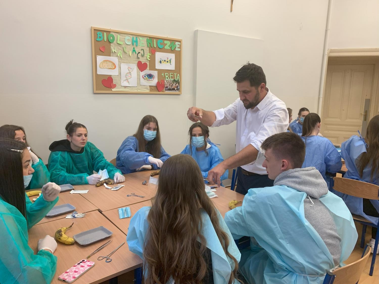 Najpierw uczniowie wysłuchali wykładu na temat różnego rodzaju narzędzi chirurgicznych, typów ran, zapoznali się z teorią szycia, a także z zasadami, jakie panują na salach operacyjnych podczas zabiegów. Następnie przyszedł czas na praktykę – zakładanie pierwszych profesjonalnych szwów z wykorzystaniem nici chirurgicznych i innych narzędzi. Jako obiekt do ćwiczeń świetnie sprawdziła się skórka banana. Opiekunem dydaktycznym młodzieży w LO jest Pani Sylwia Mikler – nauczyciel biologii.
