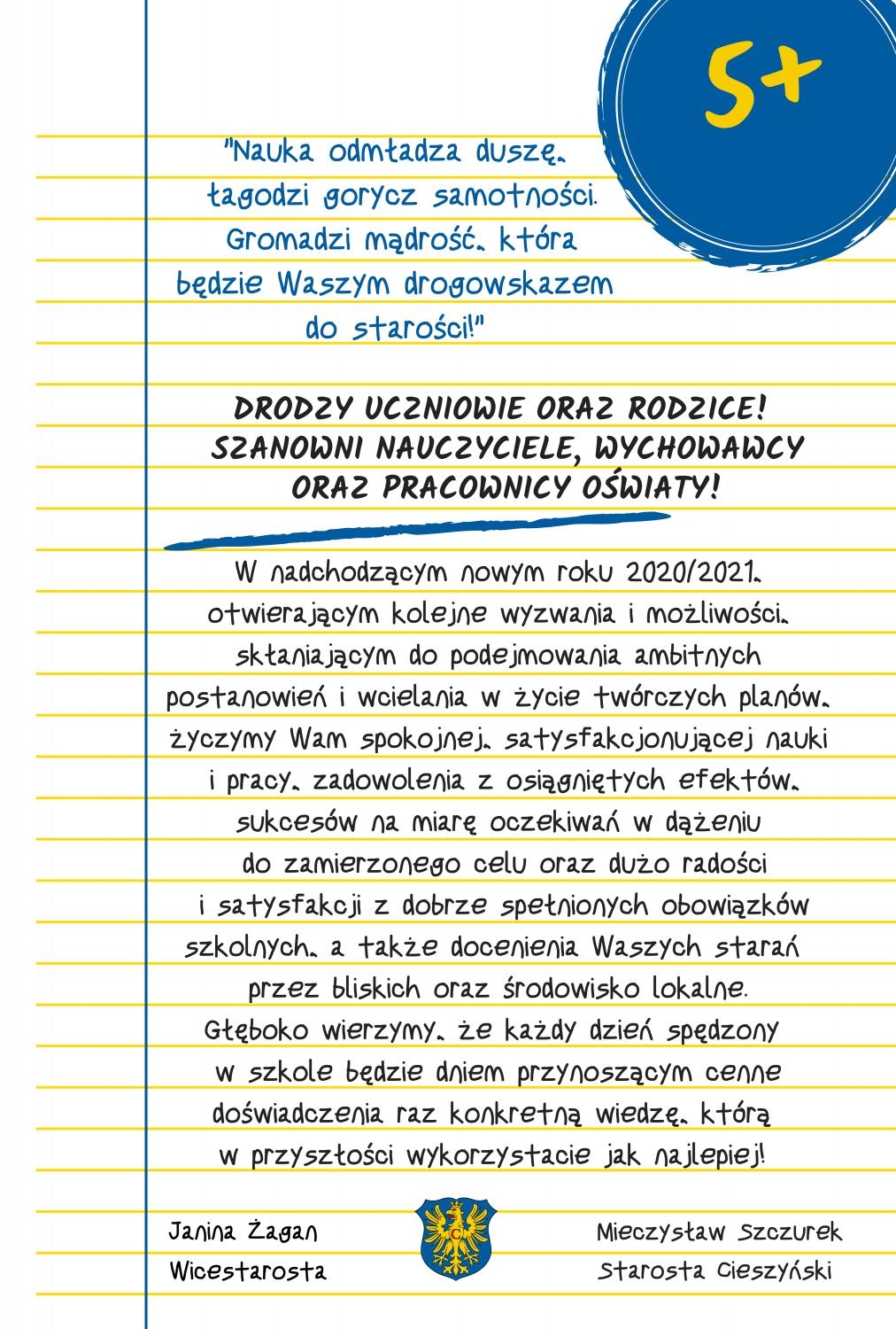 Władze Powiatu Cieszyńskiego składają życzenia na nowy rok szkolny!