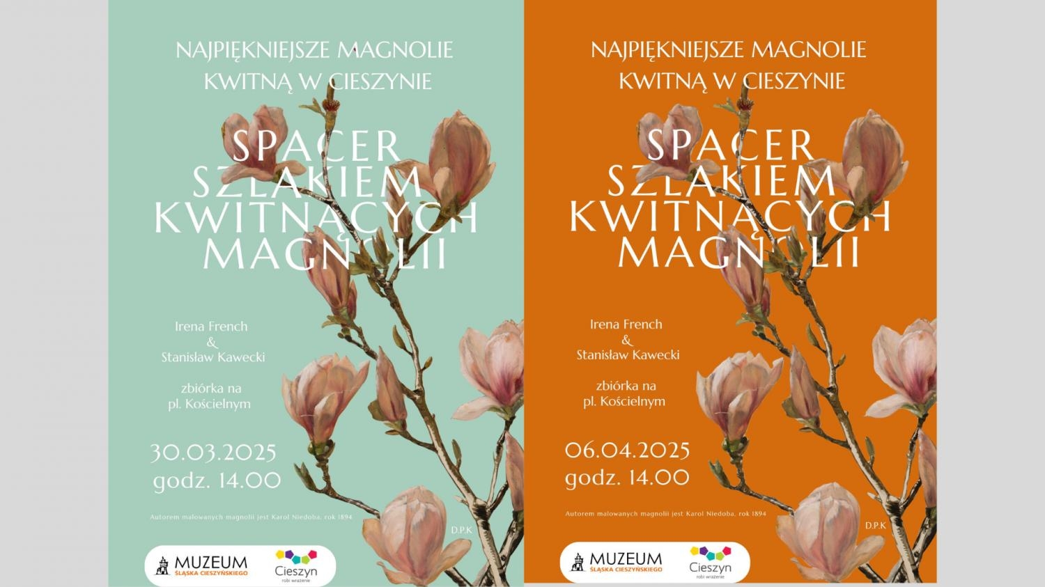 Przewodnikami będą Irena French, p.o. dyr. Muzeum Śląska Cieszyńskiego oraz Stanisław Kawecki, sekretarz Miasta Cieszyna. O tym, że najpiękniejsze magnolie kwitną w Cieszynie, mogą Państwo przeczytać na stronie dedykowanej spacerom magnoliowym TUTAJ.