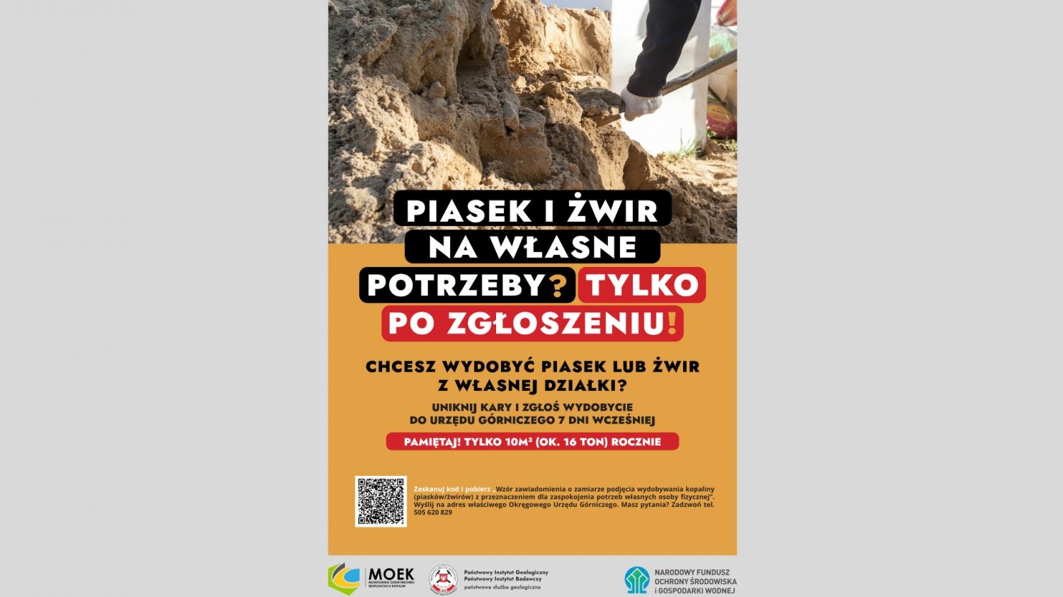 Plakat informacyjny utrzymany w tonacji pomarańczowo-czarnej z hasłem „Piasek i żwir na własne potrzeby? Tylko po zgłoszeniu!”. Na zdjęciu ręka trzymająca łopatę zanurzoną w piasku. Tekst przypomina o obowiązku zgłoszenia wydobycia do urzędu górniczego oraz limitach. Na dole loga instytucji.