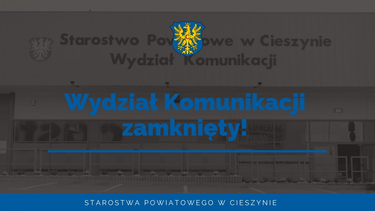 Od środy, 24 marca 2021 r. Wydział Komunikacji Starostwa Powiatowego w Cieszynie został zamknięty do odwołania z powodu nieobecności większości pracowników tego Wydziału. .