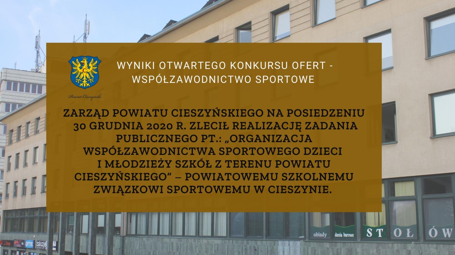 Zarząd Powiatu Cieszyńskiego na posiedzeniu 30 grudnia 2020 r. zlecił realizację zadania publicznego pt.: „Organizacja współzawodnictwa sportowego dzieci i młodzieży szkół z terenu powiatu cieszyńskiego” – Powiatowemu Szkolnemu Związkowi Sportowemu w Cieszynie (siedziba: 43-400 Cieszyn, ul. Bobrecka 29) na okres od 4 stycznia do 30 czerwca 2021 roku.