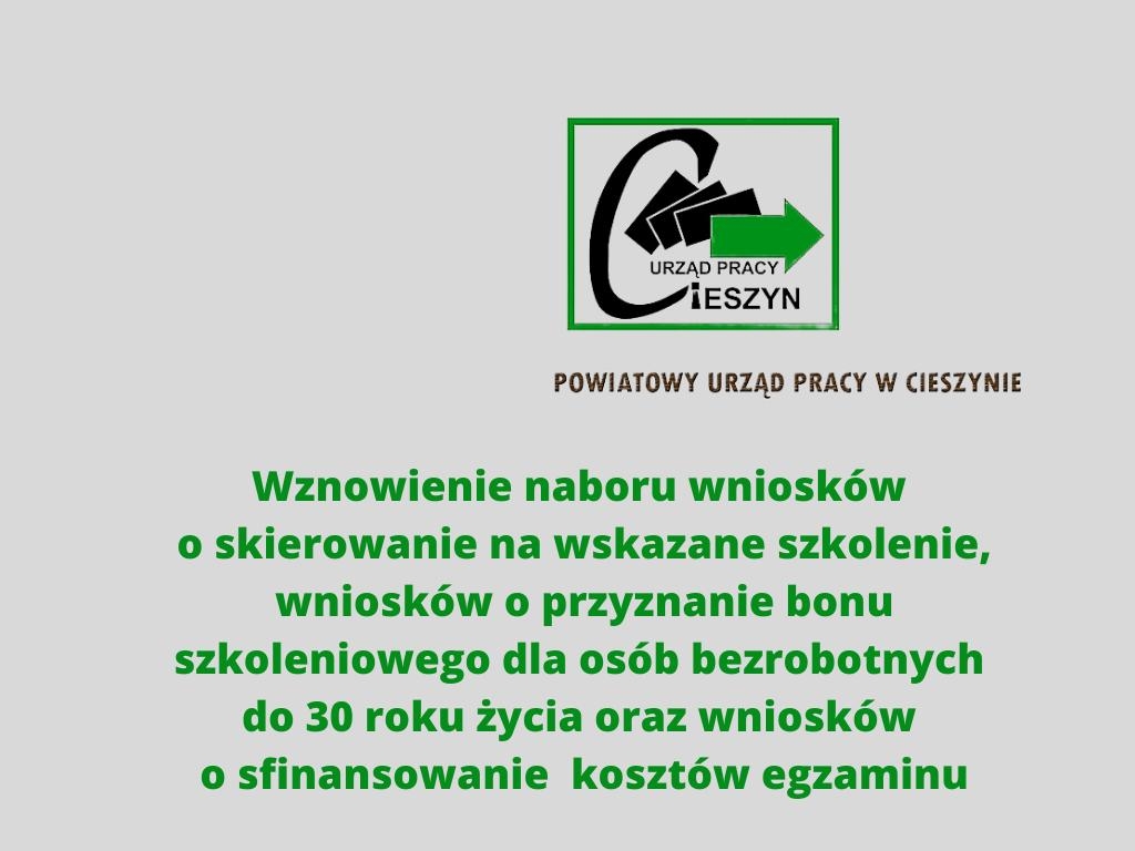 Wznowienie naboru wniosków o skierowanie na wskazane szkolenie, wniosków o przyznanie bonu szkoleniowego dla osób bezrobotnych do 30 roku życia oraz wniosków o sfinansowanie kosztów egzaminu