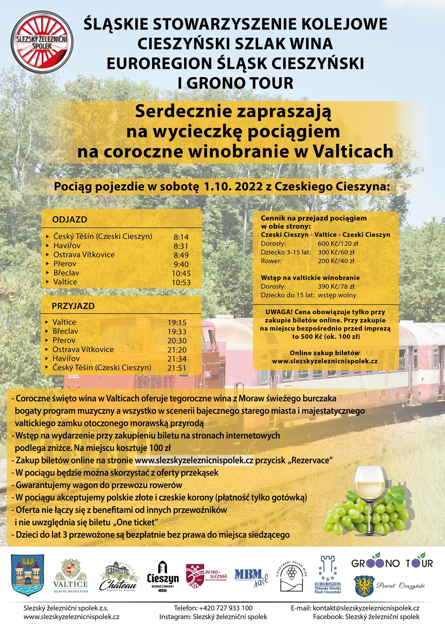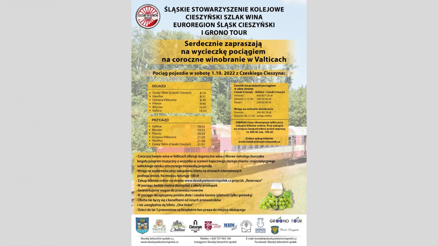 Śląskie Stowarzyszenie Kolejowe, Cieszyński Szlak Wina, Euroregion Śląsk Cieszyński i Grono Tour serdecznie zapraszają na wycieczkę pociągiem na coroczne winobranie w Valticach. Pociąg pojedzie w sobotę 1 października z Czeskiego Cieszyna.