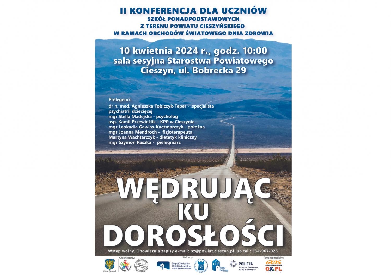 Konferencja pt.: „Wędrując ku dorosłości”, odbędzie się 10 kwietnia 2024 r. o godz. 10.00 w sali sesyjnej Starostwa Powiatowego w Cieszynie przy ul. Bobreckiej 29.