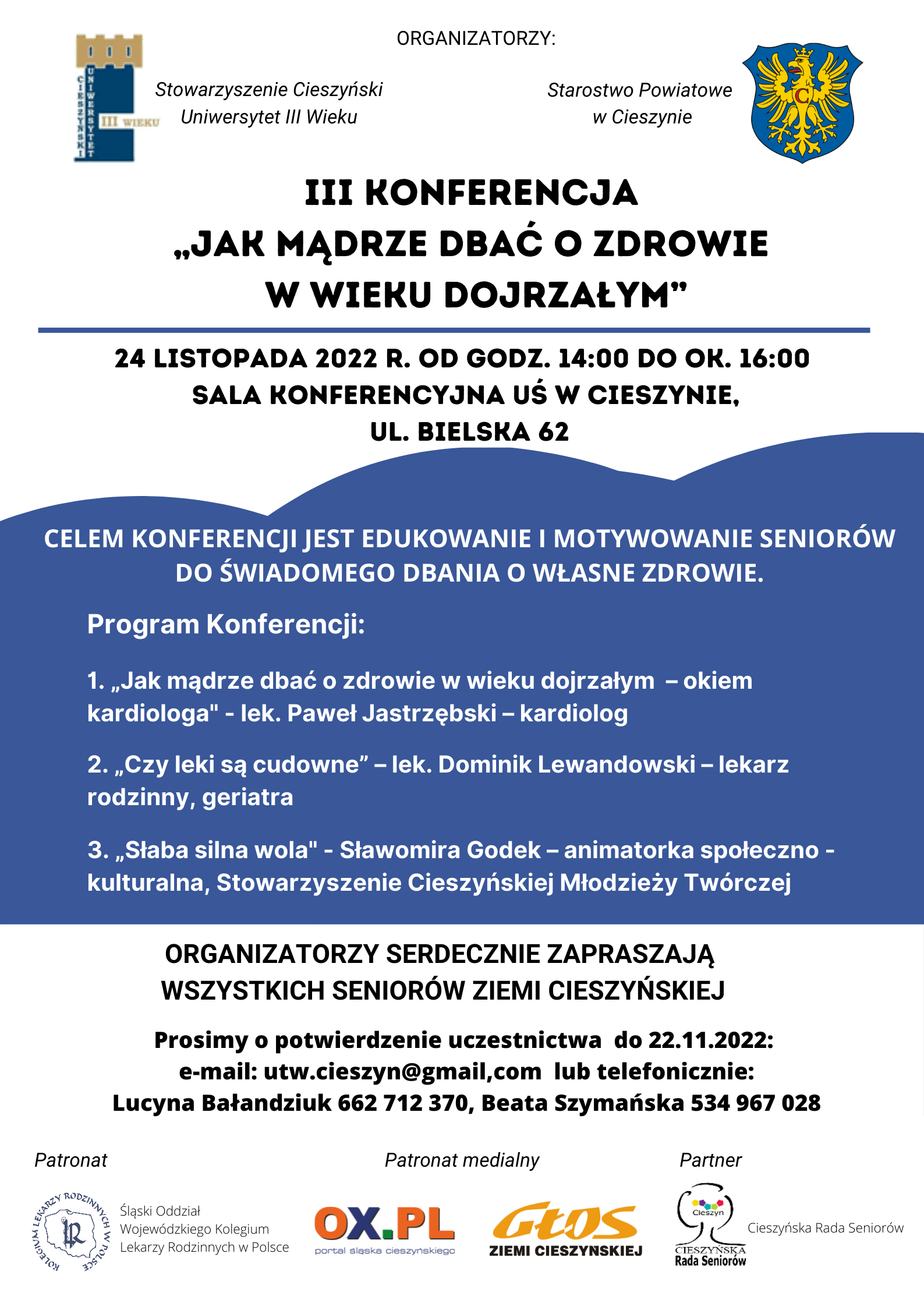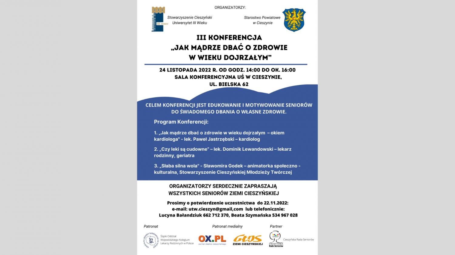Serdecznie zapraszamy wszystkich Seniorów z terenu Powiat Cieszyński do udziału w III Konferencji "Jak dbać o zdrowie w wieku dojrzałym", która odbędzie się 24 listopada 2022 r. (czwartek) od godz. 14:00 do ok. 16:00 w Sali Konferencyjnej UŚ w Cieszynie, ul. Bielska 62.