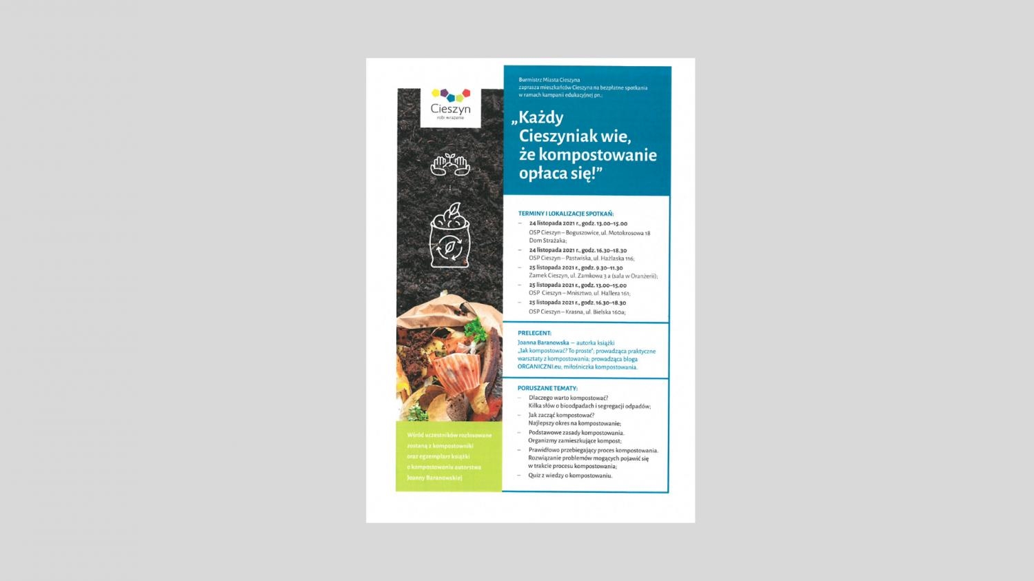 W ramach ww. akcji mieszkańcom Cieszyna zaproponowanych zostanie 5 dwugodzinnych bezpłatnych spotkań w dniach 24-25 listopada 2021 r., zgodnie z harmonogramem wskazanym na plakacie załączonym do niniejszej informacji. Podczas spotkania omówione zostanie wiele praktycznych zagadnień z zakresu kompostowania w przydomowych kompostownikach. Warsztaty/prelekcje mają na celu zachęcenie mieszkańców do wykorzystania powstających w gospodarstwach domowych bioodpadów, a zaproszony prelegent udowodni, że kompostowanie nie jest trudną techniką i z powodzeniem każdy może samodzielnie przetwarzać odpady organiczne w swoim domu, a tym samym zmniejszyć ilości wytwarzanych odpadów.