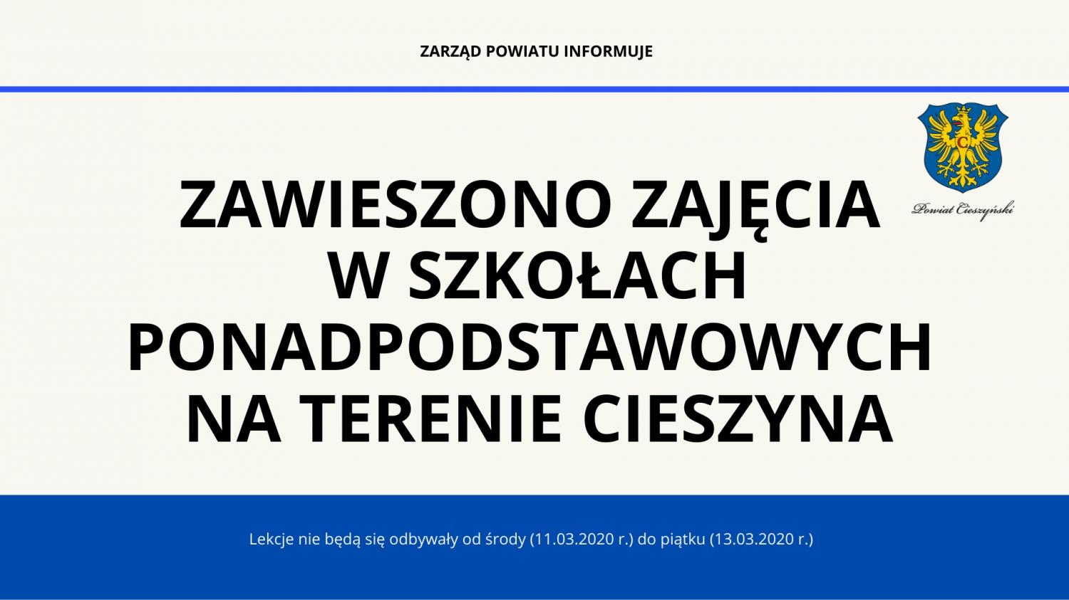 W związku z pojawieniem się koronawirusa na terenie powiatu cieszyńskiego Uchwałą Zarządu Powiatu Cieszyńskiego z dnia 10.03.2020 r., zostały zawieszone zajęcia w szkołach ponadpodstawowych znajdujących się na terenie miasta Cieszyna, dla których organem prowadzącym jest Powiat Cieszyński. W tym czasie placówki zostaną poddane dezynfekcji.