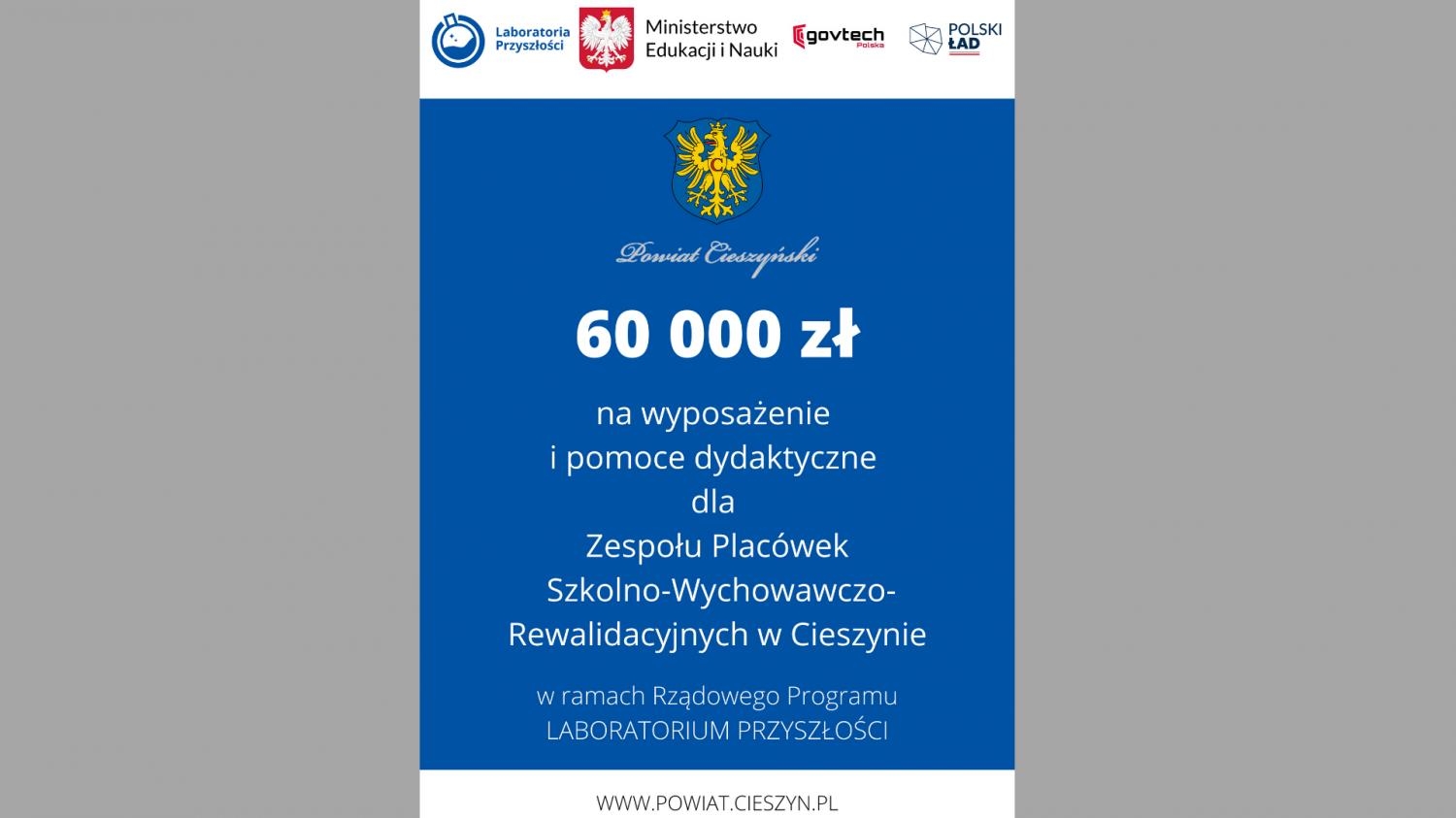 Zespół Placówek Szkolno-Wychowawczo-Rewalidacyjnych w Cieszynie informuje, iż w ramach rządowego programu pn. "Laboratoria Przyszłości" wydatkował 60 000,00 zł z czego przeznaczył kwotę 8 310,00 na zakup wyposażenia, natomiast za kwotę 51 690,00 zakupiono potrzebne pomoce dydaktyczne.