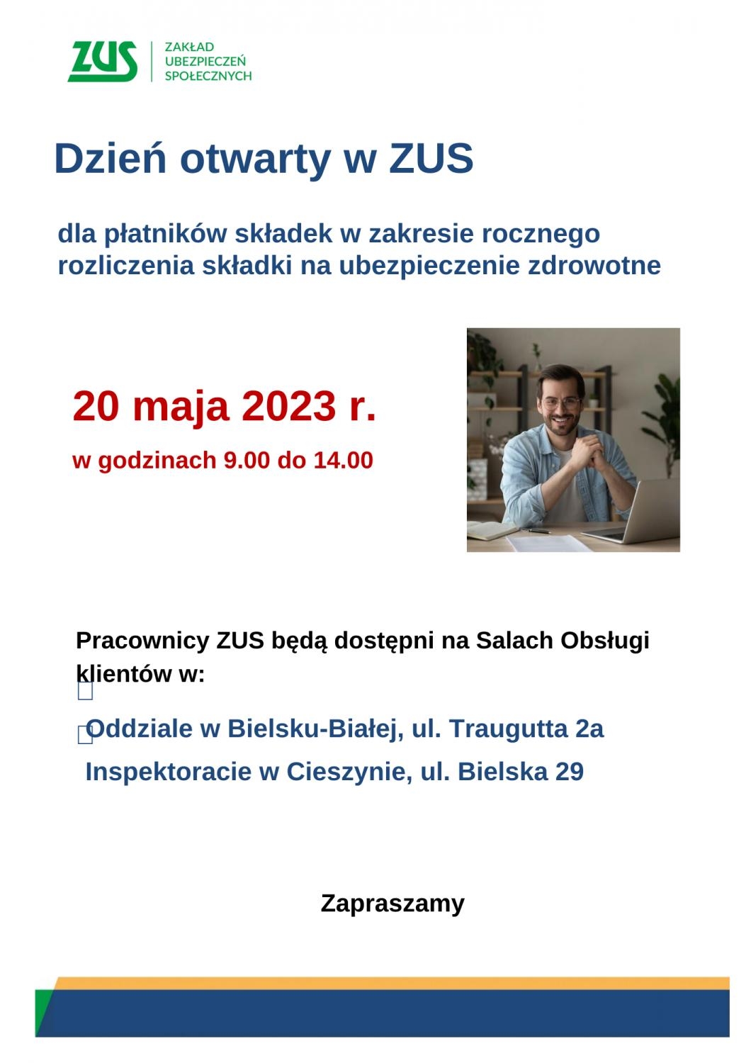 ZUS - Dzień otwarty w sobotę 20 maja 2023 r. dla płatników składek w zakresie rocznego rozliczenia składki na ubezpieczenie zdrowotne.