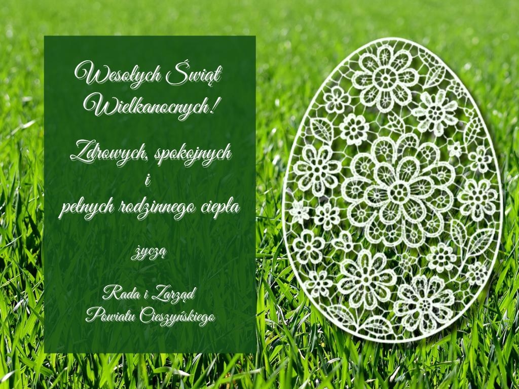 Zielona trawa w tle, po lewej stronie życzenia wielkanocne w białej, ozdobnej czcionce na zielonym prostokątnym tle. Po prawej stronie duża, koronkowa pisanka w białym kolorze z kwiatowym wzorem.